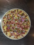 Red sauce, crispy bacon, Italian sausage, onion medley, green peppers, Roma tomatoes, and cheddar cheese.