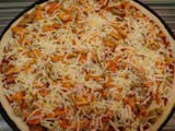 Buffalo sauce, jalapeno bacon, buffalo chicken, banana pepper rings, jalapeno peppers and topped with pepper jack cheese
