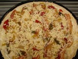 Alfredo sauce, garlic chicken, jalapeno bacon, roasted onions, peppers with pepper jack cheese.