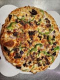 5 meat plus veggies. Red sauce, pepperoni, sausage, Canadian bacon, ground beef, crispy bacon, mushrooms, onion medley, and jalapeno peppers!