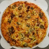 Red sauce, pepperoni, Italian sausage, Canadian bacon, onion medley, green peppers, mushrooms, green olives, and black olives.