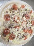 Red sauce, black olives, mushrooms, onion medley, green peppers, and Roma tomatoes.