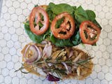 Creamy white garlic sauce, garlic chicken, red onions, fresh spinach, minced garlic, Roma tomatoes, rosemary sprig, and asiago cheese.